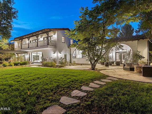 Exquisite 7,200-square-foot Spanish-style estate is nestled on nearly 4 beautifully landscaped acres in the coveted Old Agoura neighborhood. As you enter through private gates and ascend the long driveway, you are greeted by classic courtyards and stunning Spanish architecture. The heart of the home features a newly expanded kitchen, seamlessly integrated with the great room, soaring ceilings, and elegant wooden cross beams. The kitchen is a chef's dream, equipped with top-of-the-line appliances, a gorgeous quartz countertop and matching island, an automatic privacy shade, and a butler's pantry. Adjacent to the kitchen is the formal dining room with Fleetwood glass wall that creates a seamless transition to the outdoors, wine storage, cozy family room with an additional fireplace, office, and full bath with convenient access from the pool. The first floor includes a powder room, bedroom ensuite, laundry room, and direct garage access. Upstairs, the primary suite offers a private living room, dual-sided fireplace, an expansive balcony, and generous closet. The ensuite bath oasis features a freestanding tub with scenic views, dual vanities, stone shower, and water closet. The opposite wing houses a separate family room shared by three additional bedroom ensuites and two beautifully remodeled bathrooms. The exterior is equally impressive, with expansive lawns, mature trees, recently updated pool with fountain and spa, covered lanai, multiple seating areas, and fire pits. For equestrian enthusiasts, the property includes a Castlebrook Breezeway barn with powder-coated steel and wood siding, in-and-out stalls for up to nine horses, an arena, and a wash rack. You can ride directly off the property to miles of National Park trails. Additional features include raised garden beds, motor court with space for 6-8 cars, and room to build an ADU with a separate entrance or sport courts.