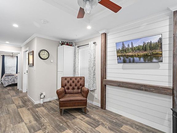 Charming 1 bed, 1 bath home in the quiet Valley breeze community! This home offers a warm, modern feel the moment you step onto the covered front porch. Inside, you’ll find a spacious layout with stylish finishes throughout, including crown molding and tasteful trim work. The living area is bright and cozy, featuring a shiplap accent wall, mounted TV space, and an efficient stove for added comfort. The kitchen is truly impressive for its size—complete with white cabinetry, sleek hardware, tile backsplash, upgraded fixtures, a deep stainless-steel farmhouse sink, gas range, and plenty of storage. The bedroom is well-appointed with great natural light and built-in cabinetry, and the bathroom offers a clean, updated design with a walk-in shower and ample counter space. A stacked washer and dryer are conveniently located in the hallway. Located near amenities while still offering peace and privacy, this home is ideal for downsizing, simplifying, or investing. A clean, move-in ready home at an affordable price!