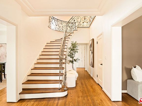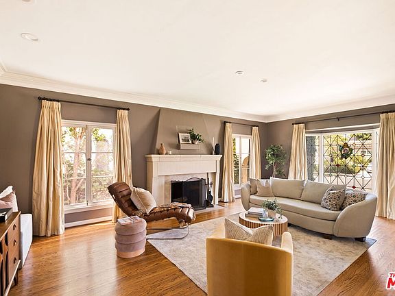 Grand Dame 1930s Mediterranean residence in the heart of Beverly Grove. A classic layout spanning more than 3,000 square feet with preserved period detail, thoughtful updates, large scale and classic comfort a stellar and quality vintage home, harder and harder to find today. Enter through a wrought iron gated courtyard into a center hall plan and formal entry, where a sweeping staircase rises beneath a leaded stained-glass skylight. The main floor unfolds to multiple public spaces including: a high-ceiling living room washed with daylight from multiple exposures and an impressive wood-burning fireplace, formal dining room, a richly paneled den (5th bedroom or media room) opening directly onto the yard through French doors...all offering plaster detail, narrow gauge original oak hardwood floors and other textured features. The kitchen provides top-of-the-line appliances, ample storage, and an adjoining breakfast room overlooking the garden. Completing the first floor is a guest suite with recessed lights, California basement for extra storage, 3/4 bathroom, separate laundry/mudroom, and dual zone HVAC. Upstairs are 3 large bedrooms, including the capacious primary suite with dressing room/walk-in closets, private balcony overlooking the courtyard, and a marble-clad bath with separate tub and shower. Two additional bedrooms share a Jack-and-Jill bath; a rear deck completes the upstairs. The rear of the home offers various spaces...lawn area, patio for al fresco dining, and direct access to the garage. Rarely does a residence at this price, with this level of character and scale come to market, set in a central location near The Grove, LACMA, the Academy Museum, Fairfax/Wilshire Metro Line (opening fall '25) and some of the city's best shopping and dining.