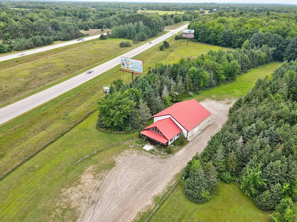 The most fabulous Barnaminium we have ever had the pleasure to sell. Comes with approximately 5 acres on an irregular parcel. Adjacent to I75. Approximately 1 mile North of Sterling Road. Reside in this fabulous log Engineered residence and have your hobby/business/toy storage facility in your own home. Residence has 2 to 3 bedrooms and 2 bathrooms with an additional bath in the 54 x 60 back building built with SIPS system (structual insulated panels). Floors are heated with in floor radiant heat. Main building has 3 insulated automoatice garage doors.Exposure to approximately 25,000 vehicles passing by on I75 daily. Residence heating system is a boiler &/or outside wood. Two split a/c systems. 14 x 60 motor home bay with sewer, water and electric.