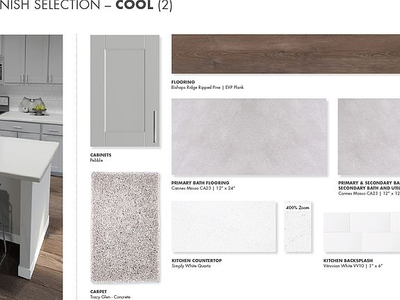 The spacious living area flows seamlessly outdoors to the covered back patio. Pebble cabinets with white pearl quartz countertops, grey cool tone EVP flooring and textured carpet in our Cool package.