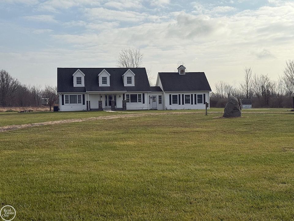 Custom built Cape Cod situated on 9.87 acres, short distance to pavement, dual entry driveway leads up to this welcoming home, recently built covered front porch & sidewalk invites you in, large living room, open kitchen w/custom maple cabinets w/under cabinet lighting & American cherry hardwood floors, stainless steel appliances, island counter & eating area, glassed dual doors lead to open & spacious family room with Mahogany hardwood floors & large wet bar, great for entertaining, 1st floor laundry room w/washer & dryer, large breezeway room off of garage entry way, 1/2 bath as well, primary bedroom w/walk-in closet, big master bath that has stall shower & jetted garden tub, 2 big bedrooms w/ample closet storage & main full bath upstairs, deep cemented/lighted crawlspace, oversized 2.5 car side turned garage w/utility sink, epoxy floor, insulated doors, separate staircase leads to huge unfinished bonus room above garage, small covered rear porch, high efficiency furnace, C/A, all vinyl exterior & trim, Andersen windows, lagoon on property is not a pond, rear of parcel is wooded, enjoy the wildlife out your backyard, plenty of room to build a pole barn, quick occupancy.