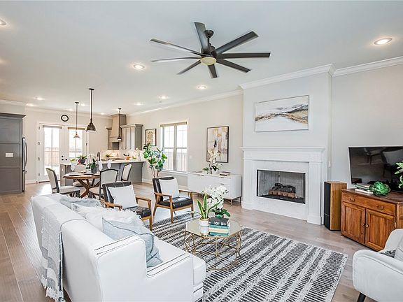 Better than New! Seller has added many upgrades: new stained privacy fence, window shades. Black out shades in primary suite, fully insulated garage w/ cabinets/work bench included. Epoxy garage flooring. Gas range is vented to outside, quartz counters, pantry & breakfast bar in kitchen. Stainless refrigerator conveys. Soft closing cabinets & drawers. Covered back patio has gas fireplace w/ tv outlet. French doors lead to the covered patio.Insulated garage is oversized w/ a fabulous workshop area that conveys. Green space across the street. Community pool/club house coming this fall.