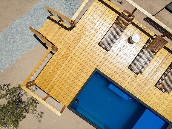garage door has translucent panels. This bonus room offers polished concrete floors, its own sliding door leading out to the backyard. Washer/Dryer and secondary storage closet. Picturesque rear yard with wooden back deck and shade ramada which enjoys stunning views of the Joshua Tree mountains. Outdoor kitchenette with BBQ grill, Fire pit, Hammock, Hot tub, Outdoor dining area, Outdoor furniture, Outdoor kitchen,Outdoor shower,Sun loungers, Movie theater and an above ground pool with deck.