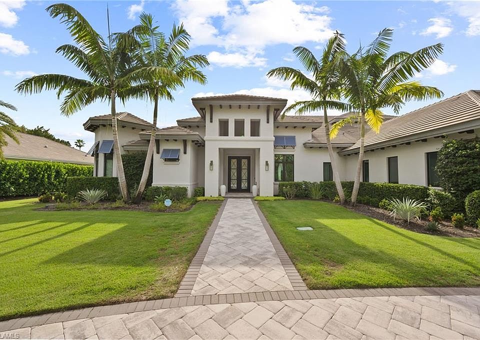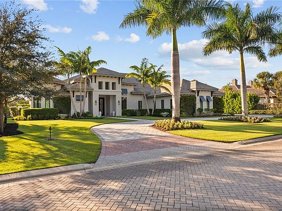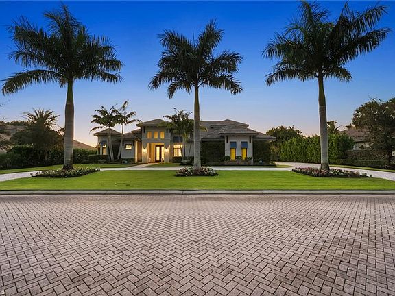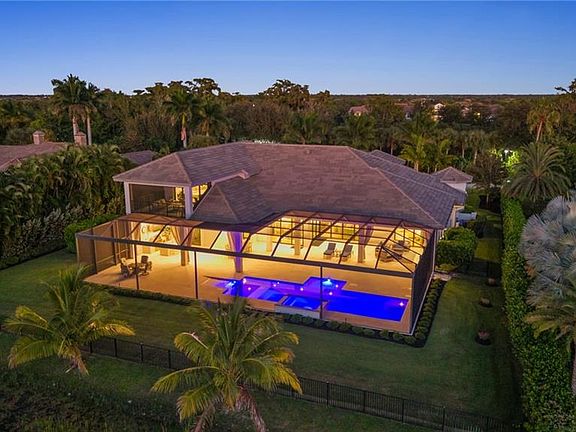IMMEDIATE GOLF MEMBERSHIP AVAILABLE with this stunning custom home built by Florida Lifestyle. Elevated 16'1 feet above sea level and equipped with impact-resistant glass and a full-house generator, this home was meticulously designed for peace of mind and modern comfort. Every detail has been thoughtfully curated—from wide-plank Legno Bastone flooring to a 1,000-gallon propane tank, water filtration system, elevator, full security setup, and Sonos sound throughout. Beautifully furnished by Clive Daniel and Norris, this home is move-in ready for effortless Florida living. The chef’s kitchen is an entertainer’s dream, featuring dual porcelain islands, Thermador appliances, a wine refrigerator, and a spacious auto-lit walk-in pantry. A nearby bar area includes an additional wine fridge and seamlessly connects to the dining space for relaxed hosting.The luxurious primary suite offers a tranquil retreat with a custom ceiling accent, blackout shades, dual walk-in closets, and a spa-like bath with new shower heads and dual water closets. Two additional en-suite guest rooms are located on the main level in a split-bedroom layout, providing ultimate privacy.Take the elevator upstairs to a spacious fourth bedroom with double vanities and ample closet storage. This upper-level guest suite also features a lounge area, TV space, kitchenette, bar, and Sub-Zero wine cooler. The upstairs private screened lanai offers gorgeous golf views. On the main level, enjoy a generously sized laundry room with pull-out bins, extra cabinetry, a storage closet, and an additional refrigerator. The oversized four-car garage includes built-in storage, a refurbished four-seat “Hole In One” golf cart, and yet another refrigerator. For even more storage, a built-in mudroom with cubbies keeps everything organized. Entertain in style on the expansive lanai, featuring a beautiful wood ceiling, gas fireplace, covered lounging and dining areas, an air-conditioned pool bath, and a two-story panoramic cage. The fully equipped outdoor kitchen includes three TVs and custom drapes, creating an intimate yet chic setting for outdoor living. With western exposure and breathtaking water and golf course views, you’ll enjoy glorious sunsets from the gas-heated saltwater pool and spa.This home truly has it all—style, functionality, and luxury—ready for you to enjoy the ultimate Florida lifestyle.
