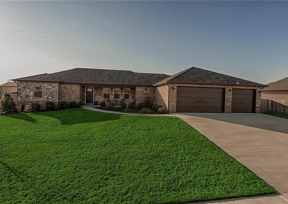 Wood privacy fence, 3 car garage, Samsung appliances, gas range, 3 cm exotic granite, custom cabinets, pedestal tub, split floor plan, high ceilings, wood floors,tile shower, and Bentonville schools.