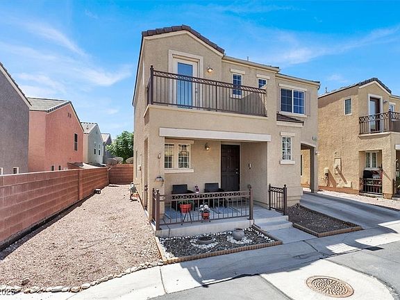 Welcome to this beautifully upgraded 3-bedroom, 2.5-bath home in southwest Las Vegas. This move-in ready residence features an open-concept floor plan with laminate flooring throughout the living room and upstairs areas—no carpet! The kitchen is equipped with granite countertops, custom cabinets, and stainless-steel appliances, complemented by wood shutter windows for added charm. The primary suite offers a walk-in closet, while one upstairs bedroom features a private balcony. The front yard provides a relaxing retreat, perfect for summer evenings. Community amenities include two sparkling pools, parks, picnic areas, and playgrounds. Conveniently located near the 215 freeway, shopping, and dining.
