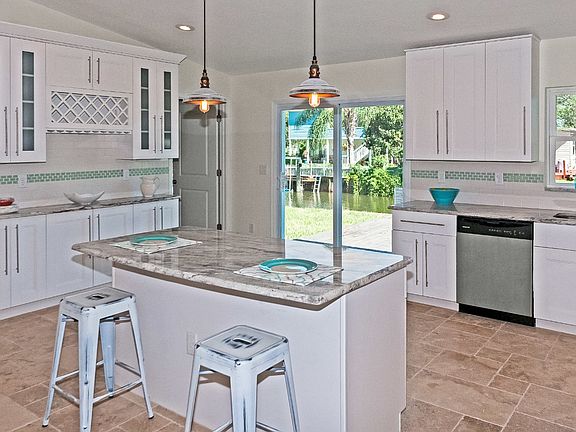 4 bd, 2 bth canal front home. Located on an exterior canal this newly dredged canal is seconds from the intracoastal waterway. A boat lovers dream come true. Brand new bulkhead ready for a dock and boat lift. The home is 100% travertine flooring for low maintenance and durability. The split floor plan makes the living room, dining room and kitchen with bar top island all blend for entertaining for relaxing. 4th bedroom is large and is perfect as guest room, formal dining.
