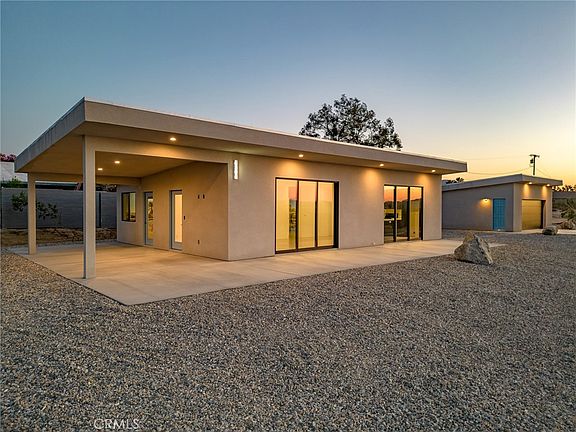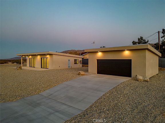 The Views are incredible. New Construction 2-bedroom 1 bath plus detached garage on oversized corner lot in a great area of 29 palms. Forever views thru the huge open glass sliders in the kitchen and living area. Home features custom cabinets, lots of recessed can lighting, ceiling fans in the bedrooms, quartz counter tops ,ruvati sink, modern plumbing fixtures, polished concrete floors, smooth drywall, custom wall prints in the bedrooms, tri zone mini split system, prewired for audio and video, tankless water heater, EV charge port,2.8 KW paid for solar system. Big, detached garage that is drywalled with automatic door opener. There is some landscaping, RV parking and still lots of room left on this property!!Realtor is licensed contractor and property owner.