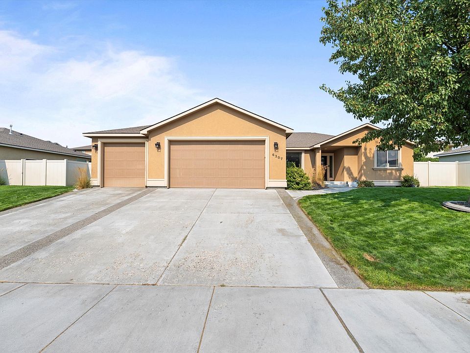 MLS# 287432 Welcome to 6307 Pimlico Dr in West Pasco, a quality-built stucco rambler offering 3 bedrooms, 2 baths, and a spacious 3-car garage with easy highway access to all of Tri-Cities. Step inside to vaulted ceilings in the living room with a cozy corner fireplace and newer laminate flooring, plus a versatile formal dining or office space off the entry. The kitchen impresses with elongated cabinetry, granite counters, full tile backsplash, and a gas stove. The split-bedroom design ensures privacy. The primary suite features vaulted ceilings, while the primary bathroom has a soaking tub, sleek shower insert, dual sinks, private toilet room, and a large walk-in closet. Outside, enjoy a private backyard with block landscaping, vinyl fencing, and a covered patio with extended concrete and hot tub hookups—perfect for relaxing or entertaining. The outdoor shed is included as well. It's a must see house!