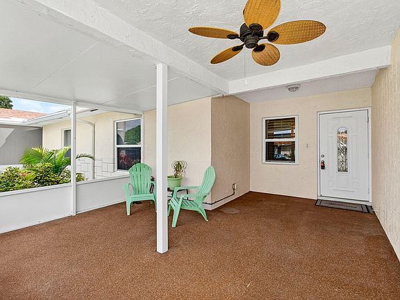 On the side of the villa, indulge in the privacy offered by a large, screened in and covered patio, surrounded by lush areca palms. This tranquil space is ideal for relaxation, outdoor dining, entertaining, or simply taking in the soothing Florida breeze. Enjoy hours of uninterrupted peace and quiet in this unique outdoor haven.
