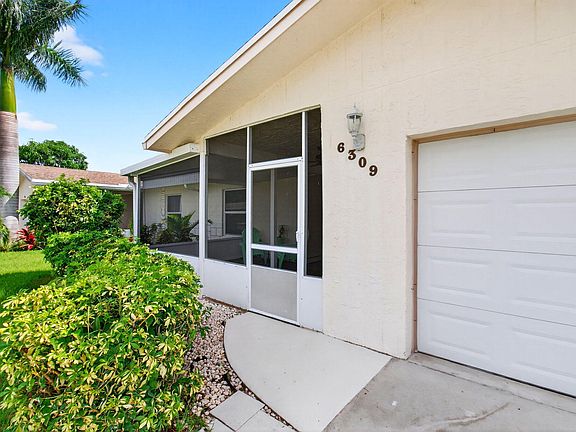 Welcome home to the serene charm and ambiance of 6309 Dusenburg Road, a meticulously maintained villa located in the sought-after Delray Villas 55+ community in Delray Beach, Florida. This inviting property radiates elegant comfort and attention to detail marked by an open floor plan and improved with both wood and tile flooring.On arrival, enter into the spacious screened in and covered front entry patio, a space that beautifully melds the comforts of indoors with the charm of exterior aesthetics. Transition from the inviting entrance to the expansive, naturally lit living area; kept reliably comfortable all year with an updated air conditioning system, installed in 2024. Enjoy the beautifully appointed open-concept kitchen, which features an abundance of counter space and 'roll-out base cabinets.