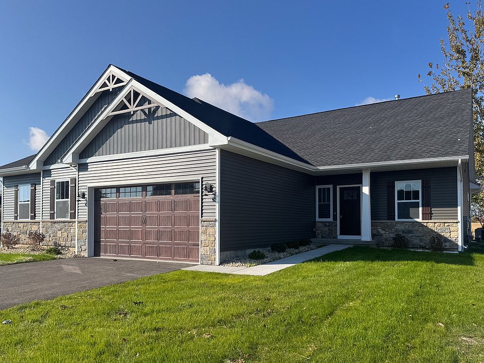 HURRY THIS COMPLETED UNIT HEAVILY DISCOUNTED WITH OVER $15,000 IN UPGRADES! Overlooking a scenic landscape with a covered rear porch so you can enjoy the peace and tranquility of nature at its finest. Stunning 3 bedroom / 2 bath condo located in a close to shopping / schools and downtown. Standard features include : fireplace / bull nose corners / double bowl vanity in master bath complete with tiled shower and glass doors . American made Cambria quartz counter tops - soft closed cabinet doors throughout / pantry with barn door / Warm heated and insulated garage / long lasting LVP throughout the entire unit / durable Delta faucets / privacy fencing / rough in bath located in basement / Custom shutters and wood brackets along with stone - vinyl exterior. We have built and closed over 400 units in Sycamore over the last 20+ years. See Realtor remarks for further details on all showings. Show your fussiest!
