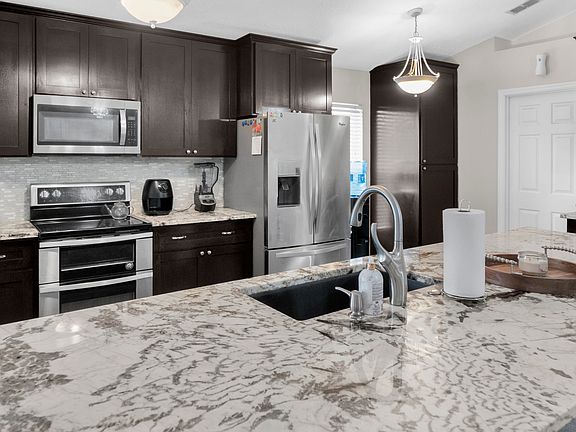 This beautiful Apopka home is a MUST SEE - tucked away in the established Lake Doe Cove community with a bright OPEN CONCEPT FLOOR PLAN, RENOVATED KITCHEN, HIGH CEILINGS and gorgeous VINYL PLANK WOOD FLOORS in all the main living areas! This home flows from the moment you walk in the front door and the wide open floor plan is highlighted by the generous LIVING and DINING areas that lead straight to the heart of this home, the stunning updated kitchen! The family chef will fall in love and look forward to preparing meals in this lovely space boasting plenty of CABINETS that go all the way up to the ceiling, STAINLESS STEEL APPLIANCES, GRANITE COUNTERS, a CUSTOM BACKSPLASH, ample storage and a massive ISLAND for even more storage and prep space and BREAKFAST BAR seating, perfect for entertaining! Ideal SPLIT BEDROOMS delivers a large PRIMARY SUITE showcasing a VAULTED CEILING, decorative ceiling fan, WALK IN CLOSET and a private EN-SUITE BATH with a large vanity, SOAKING GARDEN TUB and direct access to the backyard! Three additional bedrooms all with ceilings fans, great sized closets and high ceilings, plus an UPDATED SECOND FULL BATH complete with a CUSTOM TILED WALK IN SHOWER only add to the appeal of this must see home! FRENCH DOORS off the living area provide access to an expansive SCREENED IN PORCH perfect for creating a relaxing outdoor space, sip a cup of coffee in the morning or spend the weekend with a good book - all overlooking a spacious FULLY FENCED backyard with spectacular MATURE TREES for plenty of shade! You are conveniently located near Lake Apopka, parks, shopping, dining and can enjoy easy access to SR 429, the Florida Turnpike, SR 414, SR 451, and the Maitland Expressway to Downtown Orlando! Only minutes to the Wekiwa Springs State Park offering 7,000 acres of outdoor recreation, nature trails, and natural spring fed waters leading to the Wekiva River! With room to relax inside and out, this home is the perfect place to call home!