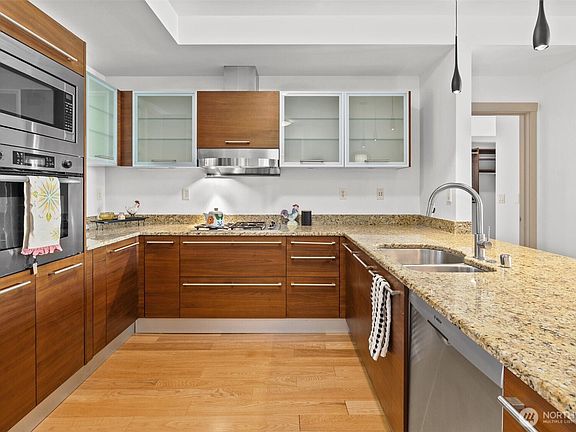 Experience refined living in Kirkland’s sought-after West of Market neighborhood. the coveted Leland Place offers quiet privacy, convenient location & west-facing light w/ peekaboo Lake Washington views. This boutique building is just a short walk to DT, the marina, waterfront parks & dining. This 2 bed, 2 bath unit offers soaring ceilings, thoughtful layout, oversized windows creating bright, open spaces. Features include a primary ensuite w/ large walk-in closets in both bedrooms, cozy gas fireplace, outdoor deck, AC & separate storage. Chefs kitchen w/ all Bosch SS appliances & granite countertops. 2 deeded covered parking spots, secure entry & solid HOA provides peace of mind. Rare opportunity to enjoy Kirklands most desirable location.
