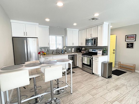 This is a 4BR/3BA single family home in a friendly neighborhood with a fenced-in backyard, large patio and brand new heated standard in-ground pool. All BRs have a queen size bed and full length mirror. There is a split floor plan with a Master BR on each side. Both have an en-suite bathroom and Roku smart TV. The living room and dining area are large and spacious with an open layout and a 65 Roku smart TV installed with YouTubeTV and sports package. The kitchen has stainless steel appliances. All windows have wooden stringless blinds. All hard floors with new vinyl tile flooring in bedrooms and tile everywhere else. There is a laundry room with a new LG full-size washer and dryer set. WiFi is fast. There is a separate 1BR/1BA guesthouse on property that may be rented with the house for an additional cost if not occupied by tenants. It has its own private street entrance and separated from the property by a 6ft privacy fence.