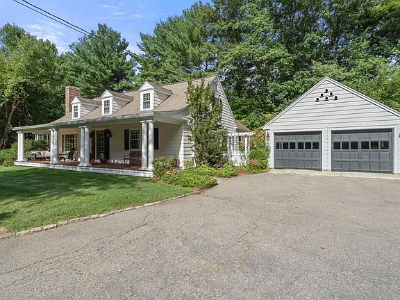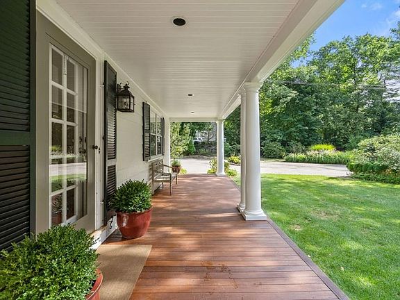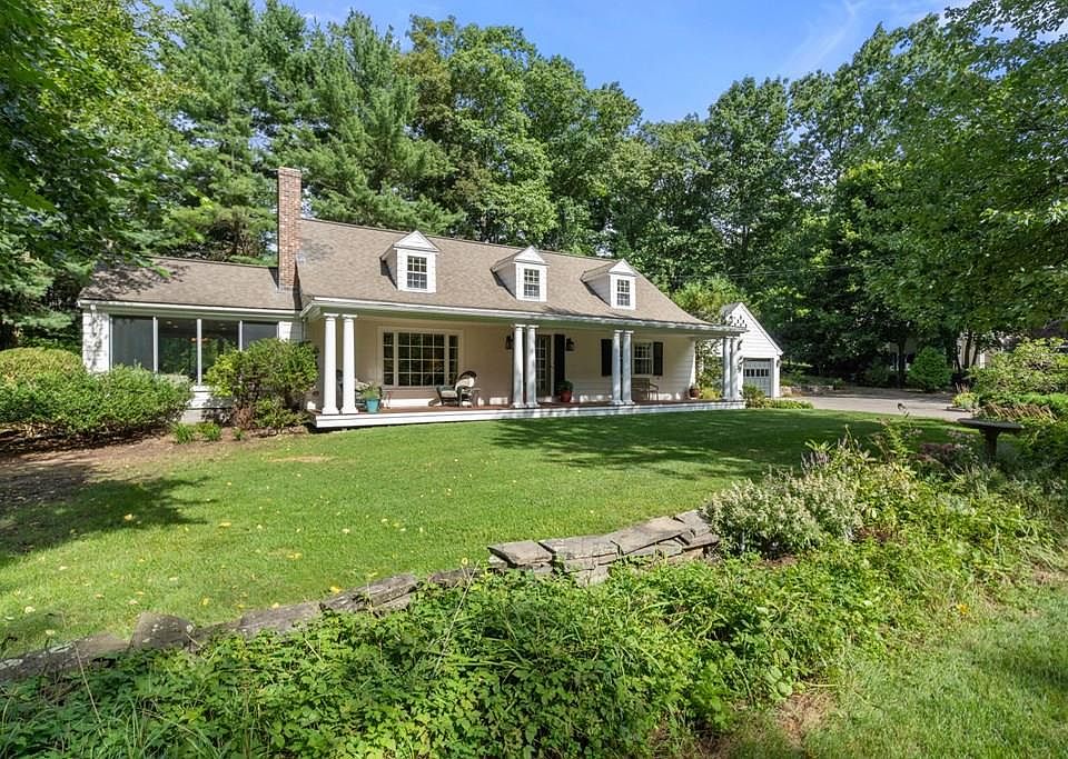 Set on a lush acre in one of Needham's most desirable neighborhoods, this gracious Cape-style retreat is convenient to town and train. A stately farmers porch with plenty of space for outdoor relaxing welcomes you home. Hardwood floors continue into central dining room w/ French doors leading to a bluestone patio. The living room features an elegant fireplace and expansive garden views, connecting to a lovely kitchen with custom cabinets, concealed appliances, prep sink and warming drawer for easy entertaining. More French doors open to the family room surrounded on all sides by floor-to-ceiling glass. Home office or extra bedroom offers flexibility as your needs change. The first-floor master suite includes a bath w/ glass and travertine shower and air-jet tub for ultimate relaxation. Upstairs find three bedrooms w/ HW floors, full bath, and hallway built-ins for work-from-home space. Large basement provides storage space & finished room for game or movie nights.