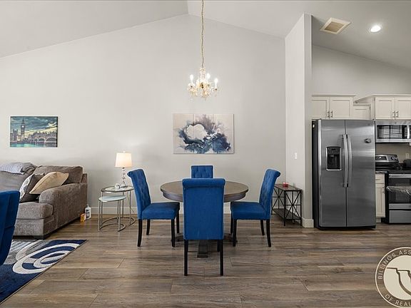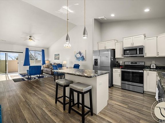 Discover this beautiful, light-filled open floor plan featuring vaulted ceilings and LVP flooring. The kitchen comes complete with stainless steel appliances, including a refrigerator, microwave, oven/range, and dishwasher. A lovely island with seating seamlessly connects to the dining area and living room, which boasts a patio door leading to a fully-fenced patio—perfect for outdoor relaxation or a pet! Primary bedroom includes full bath with dual sink vanity spacious closet and lighted make-up mirror. A second bedroom and bath with a tub offer additional comfort, while main floor laundry adds convenience. The mechanical room is conveniently located in the garage. Enjoy thoughtful updates to lighting. Don’t miss out on this gem! One Year Home Warranty offered to buyers to cover HVAC, electrical, plumbing and the tankless water heater, etc. Additional Perk: Heated and Insulated Garage
