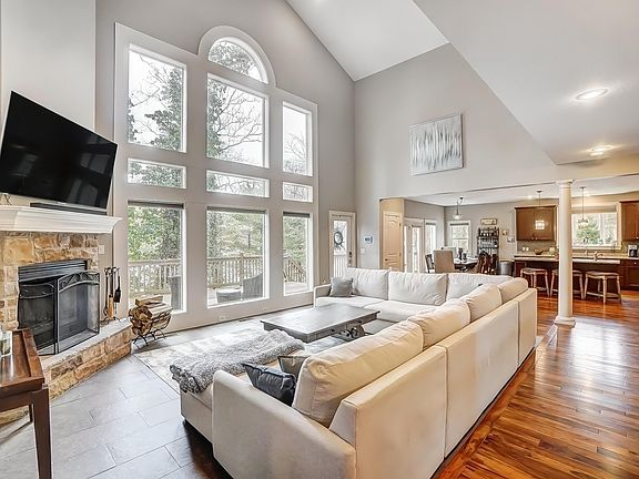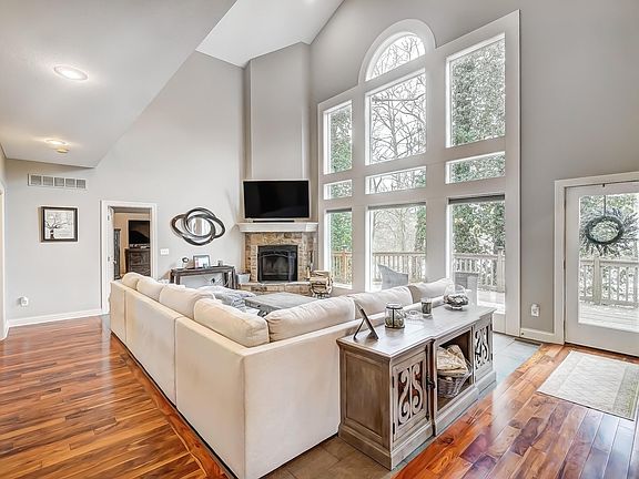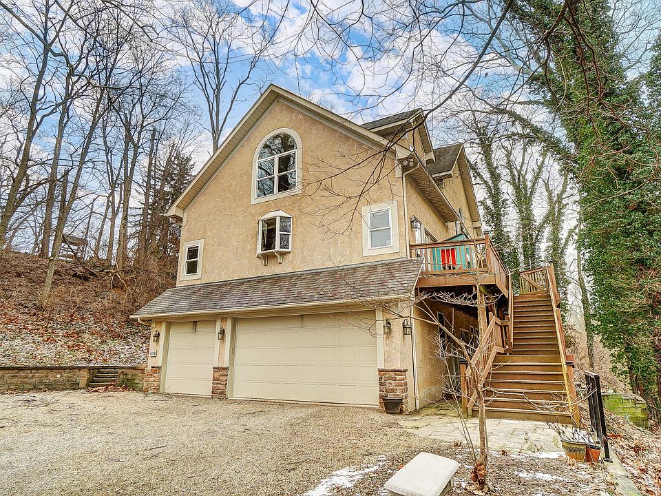 This custom built 5-bed, 3.5 bath home on a .942-acre lot is surrounded by mature trees and has a creek running through it. Stunning wood floors, fireplace with brick surround and a wall of windows accent the 2-story great room. The kitchen features SS appliances, granite counters, center island with countertop bar and an adjacent eating space. Primary bedroom on the main level includes an ensuite bath and walk-in closets. An office, half bath and laundry room complete that level. Two bedrooms, full bath and an open loft upstairs. Walk-out finished rec room includes a fireplace with stone surround. Two additional bedrooms and a full bath too. Deck along the 2nd floor overlooks the ravine, plus lower-level stone paver patio. Circular driveway and 3-car garage. Your private oasis awaits!