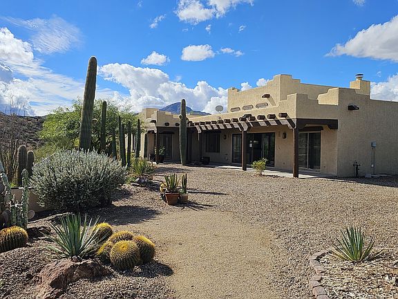 A million dollar property priced VERY low to allow you to make optional cosmetic updates. This is a rare hilltop view estate set on a very private 3.3 acre lot in the heart of the West Tucson Mountains. NO HOA & close to Saguaro Nat'l Monument Park! This Santa Fe style home was made with ultra high efficiency block construction & large spaces in mind. The split bedroom/open concept floorplan was ahead of its time and mimics many new construction layouts. New interior paint and carpet in the bedrooms make this home completely move-in ready. If you value an enormous garage, a large primary closet, tall ceilings and elevated views of the city & Catalina Mountains, this is your place! Gardeners will be delighted with many established specimens throughout the grounds.