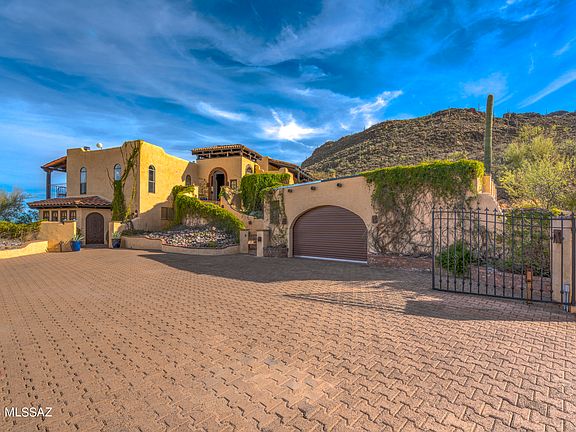 Distinguished mountainside residence in Trails End Estates, bordering Tucson Mountain Park, north of Gates Pass. This majestic marvel is perched on a high overlook - w/ breathtaking panoramic views in every direction (mountain, desert, city, sunrise, and sunset!). Indoor features include tasteful wood floors, spectacular wide windows, cozy gas fireplaces, updated kitchen (w/ quartz counters, breakfast-bar, & electric range), & expansive finished separate downstairs guest quarters with private entry, walk-in closet, & en-suite full bathroom. Outside, find serene sanctuary spaces & exquisite entertainment enclaves - impressive central court-style gates driveway w/ guard-booth, stunning veranda w/ terraced wrap-around patio & walkways (plus built-in wood/charcoal barbecue and outdoor gas fire-bowl). Must see to truly appreciate - especially during evening twilight!
