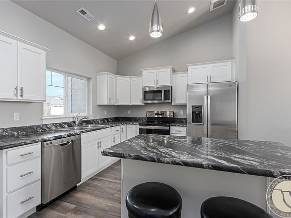 Open floor planWalk in closetLvp flooringTwo sink vanityFenced patio areaVaulted ceilingsStainless steel appliances