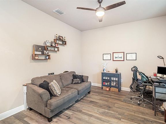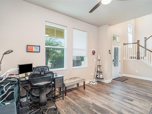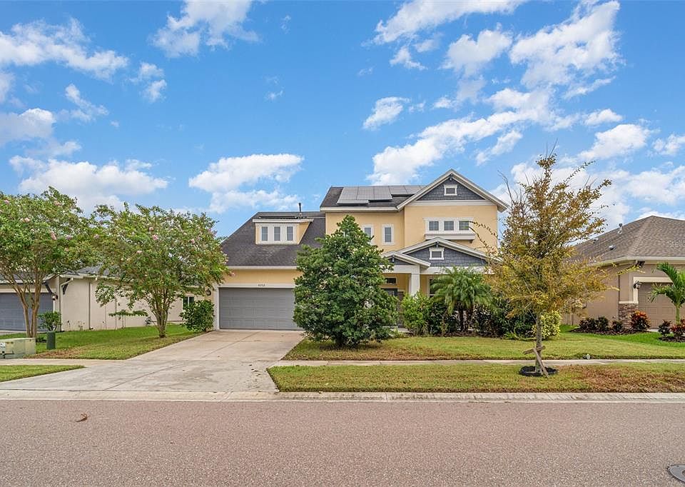 3.56% Assumable VA Rate! Discover the art of Florida living in this stunning, nearly new David Weekley residence within the exclusive Waterset community. The private, resort-style backyard is an entertainer's paradise, featuring a breathtaking heated saltwater pool with multiple sun shelves. The expansive screened lanai offers a seamless transition to the extended yard outdoors, creating a private oasis for relaxation and sophisticated gatherings. Inside, refined design awaits with elegant wood-look laminate flooring gracing a bright, open-concept floor plan that includes the living, dining, and gourmet kitchen areas. The chef's dream kitchen is equipped with a high-end gas cooktop and built-in oven, designed for both everyday meals and elegant entertaining. Beyond the kitchen is a breakfast area and a bar-style counter with two wine refrigerators. A dedicated study provides a quiet retreat, while a main-level guest suite with a full bath ensures privacy for visitors or multi-generational living. Upstairs, the owner's suite provides a luxurious escape, complemented by a massive loft, two additional bedrooms, and a conveniently located laundry room. A three-car garage features a Tesla fast charging station and a whole-home water purification system, adding to the home's practical side. Beyond your home, the award-winning Waterset master-planned community delivers a lifestyle of unparalleled leisure and recreation. Residents enjoy access to three sparkling pools, exhilarating waterslides, multiple playgrounds, and a splash pad. Get active with two state-of-the-art fitness centers and courts for basketball, tennis, pickleball, and volleyball. Explore miles of scenic walking and biking trails, meet up at the dog parks, or grab a bite at the on-site café. With an abundance of amenities, Waterset is not just a neighborhood—it's a destination.