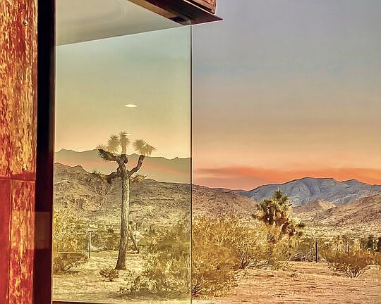 Sophisticated floorplanWild desert sceneryOpen-air atriumCustom glass doorSpectacular sunset vistasRoof deckLong narrow storage building