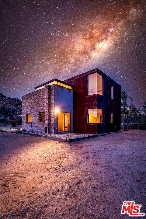 First time on the market: the prestigious Rotohouse, in the exclusive Monument Manor neighborhood of Joshua Tree, California. This organic architectural treasure is just a mile to the entrance of the popular Joshua Tree National Park, sitting between two large mounds of boulders enhanced by spectacular sunset vistas. House designed by world-class architect Michael Rotondi in 2007 and renovated over the course of 10 years. The main entrance is through a custom glass door entering a fun open-air atrium. The sophisticated floorplan incorporates 2 stories 1,845 sq feet, with 10ft. ceiling in the upstairs bedroom and 14ft. high opening on downstairs bedroom, three bathrooms, two in the master suite, his and hers. Characterized by simple forms and open volumes, the main addition is a cube 25 feet on each side. Adjacent to that is a long, narrow storage building with a roof deck pointing to a phenomenal spectacle of heaped rocks and sexy Pinto Mountains. Raw and handcrafted, the rugged exterior wrapped in corten steel set the trend for hi-desert buildings. Mondo central air eases extreme desert climate offering perfect comfort throughout. Every custom window frames extraordinary and enchanting wild desert scenery. The included adjoining 2.5 acre parcel is priceless on it's own. It offers the perfect location for a potential second epic dwelling; perhaps on piers, so as to offer infinite vistas east and west. With this purchase you are not just buying a house but the true character that inspires the Joshua Tree nature and lifestyle.