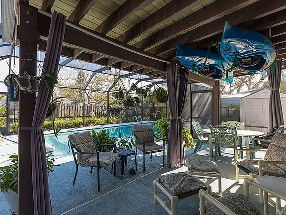This 3 (possible 4) bedroom, 3 bath two story house is nestled in trees for privacy. Offers a spacious screened in saltwater pool with fully fenced landscaped backyard. Great entertaining space downstairs with two living areas, bedroom and full bath that could easily be a spacious in-law or teen suite. Upstairs offers bright and open living/dining area floor plan with two fireplaces, one being in master bedroom. Guest bedroom with walk in closet and full bath. Room for RV on site! $5000 seller Credit for Closing costs! Beautiful front screened porch gives the feeling of a secluded tree house as you overlook greenery. Newly replaced back deck is expansive for grilling and entertaining, yet can be very peaceful sitting in the sun listening to the ocean waves.