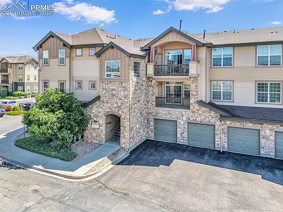 This inviting 2nd-floor condominium in The Vistas at Nor'wood offers a garage space and 1,198 square feet of comfortable living space with stunning views of Pikes Peak. The open floor plan features a spacious living room with a gas-log fireplace and a slider leading to a covered patio with additional storage. The eat-in kitchen includes a counter bar with pendant lights, ample cabinets, and an adjoining dining area. The primary bedroom serves as a retreat with a walk-in closet and an adjoining full bathroom featuring a dual sink vanity and tub/shower. A second bedroom shares a full hall bathroom. Additional amenities include a laundry closet with washer and dryer, central air and heat, and window blinds throughout. The community offers beautiful green spaces, a pool, and a sauna. The HOA provides lawn maintenance, snow removal, and trash services for low-maintenance living. Conveniently located within walking distance of schools and close to shopping, dining, and entertainment options along the Powers Corridor and Academy Blvd. This condominium is ready and awaits you to make it your new home.