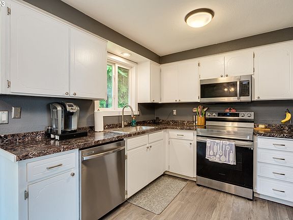 Single Level Sensation perfect for new beginnings! Thoughtfully updated with fresh touches throughout plus 1 year NEW appliances. Step inside and be greeted by an inviting space that seamlessly blends comfort and style. Stunning feature wall brings the outdoors in and creates a unique focal point in the living area. Imagine relaxing in this beautifully designed space, surrounded by nature-inspired elements that add a touch of serenity to your everyday life. One of the standout features of this home is the puppy approved laminate flooring, providing a durable and pet-friendly surface that is easy to maintain. Whether you have a four-legged friend or not, this flooring is perfect for anyone seeking a low-maintenance lifestyle. The true highlight of this home awaits outside a private, tree-lined backyard that feels like your very own slice of paradise. Step onto the covered deck, the ideal setting for al fresco dining. The lush greenery and the gentle whisper of the wind through the trees create a serene ambiance, perfect for creating cherished memories. With its central location, you'll enjoy the convenience of easy access to the highway for quick getaways and stress-free commuting. Need to stock up on supplies? Costco is just around the corner, ensuring that your shopping trips are a breeze. And when it's time to unwind and enjoy the great outdoors, friendly Walnut Grove neighborhood park offers the perfect setting for picnics or playful adventures.
