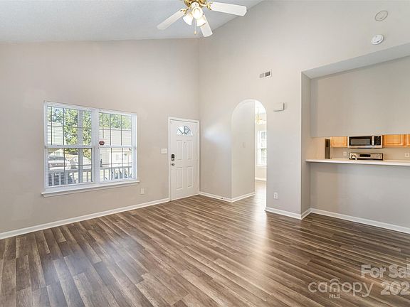 The open-concept living area flows seamlessly through an inviting archway into the kitchen, which features warm light wood cabinetry—perfect for both daily living and entertaining.