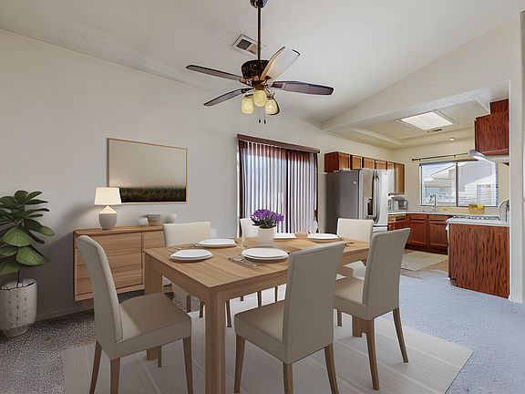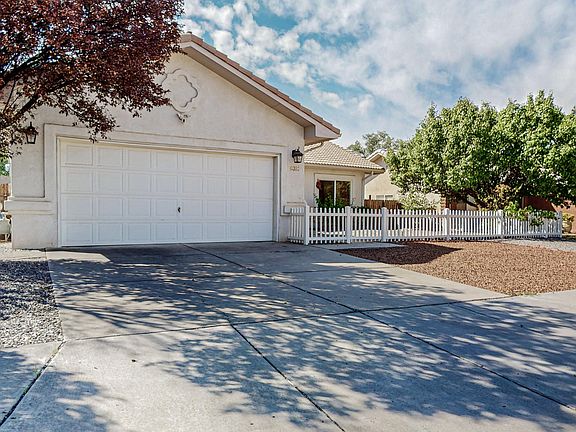 La Cueva Beauty: Located just minutes away from North Domingo Baca Park and fabulous shopping, this property boasts high ceilings. Contemporary-looking ceiling fans adorn all rooms. The kitchen seamlessly opens to the living area and leads out to the dining space. Luxurious carpet features premium underlayment. Beautifully designed drapes and blinds are included. The front yard is charming, with a short, adorable fence and a multicolor Xeriscape. Additionally, there's a green apple tree and a Japanese black plum tree, enhancing the superb curb appeal. The backyard is perfect for entertaining, featuring super functional, artistically designed pavers and a custom-installed sitting bench that spans the width of the property. A storage unit is available in the backyard.