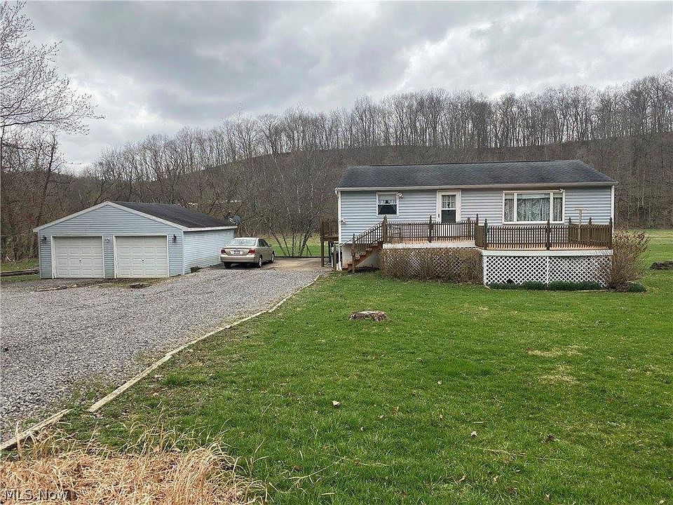 Nice convenient country setting in John Glenn schools! This raised ranch home has 4 bedrooms and 2 full baths. Spacious Living room and fully finished walk out basement which includes 2 of the bedrooms, family room, full bath and a canning kitchen. There is also a 2 car detached garage and a storage building. Nice big deck off of the front of the home. There are 5 acres that's included with this great home. Some of the acreage in the back of the property is wooded. Part of the back yard is in the 100 year flood plain. Flood map does show house and garage being outside of the flood plain.