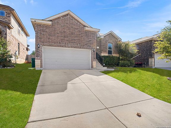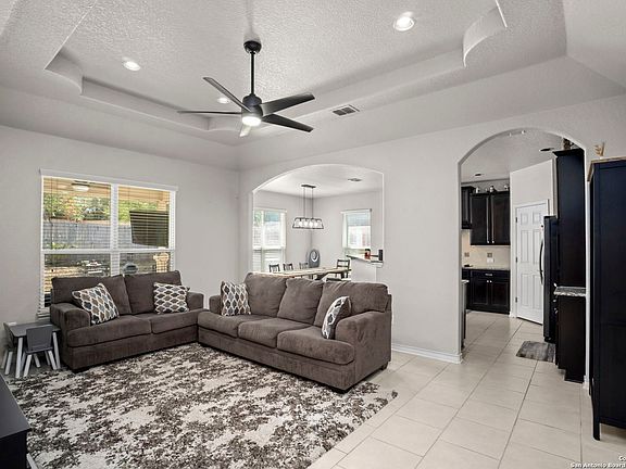 Step into a beautiful New Leaf Home that offers both style and convenience in one of San Antonio's most accessible locations. This property represents a unique opportunity, as New Leaf Homes are no longer being built in this area making this residence truly stand out among surrounding new construction. From the moment you arrive, you'll be drawn in by the dramatic red-brick archways and welcoming curb appeal. Inside, the home opens to tall tray ceilings in multiple rooms and bright, open living spaces designed for comfort and connection. The kitchen is a showstopper, featuring granite countertops, dark modern cabinetry, a bar island, modern fixtures, and even a built-in wine fridge-perfect for entertaining or relaxing after a long day. The spacious backyard offers a great balance of green space and privacy, complete with a covered patio ideal for summer gatherings, weekend barbecues, or simply unwinding outdoors. Located near major highways including I-35, Loop 410, and Wurzbach Parkway, this home provides quick access to Randolph AFB, Fort Sam Houston, and downtown San Antonio. You'll also enjoy being minutes from shopping, dining, and entertainment options, making daily life as convenient as it is enjoyable.