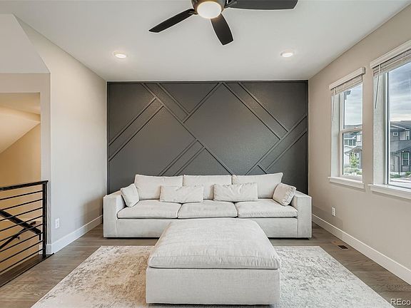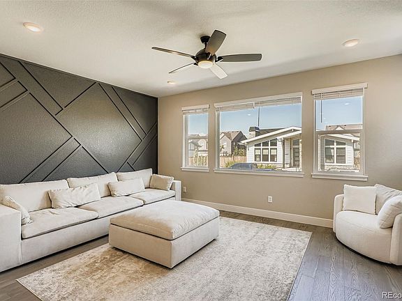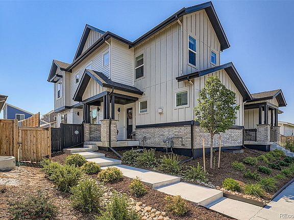 Welcome to this stunning Brookfield Villa 4. Designed with high-quality soundproofing to ensure a quiet living environment. This beautifully crafted paired home features 4 bedrooms and 3.5 bathrooms and is located in the heart of Central Park’s North End, just steps from the Rocky Mountain Arsenal National Wildlife Refuge and Butterfly Park. Step inside to an open, light-filled main level with beautiful hardwood floors that set the tone for sophisticated yet comfortable living. Throughout the home, thoughtfully designed accent walls add depth and character, elevating the overall aesthetic. The inviting living room is centered around a gas fireplace with a floor-to-ceiling tile surround and a sleek floating wood mantel. A spacious dining area connects seamlessly to the heart of the home and opens directly to your own private backyard oasis. Designed with low-maintenance living in mind, the backyard features a patio and a composite-wood deck, ideal for outdoor entertaining, grilling, or simply enjoying the Colorado sunshine. The chef’s kitchen is sure to impress with its white, soft-close cabinetry, sleek quartz countertops, spacious island, elegant backsplash, and premium stainless steel KitchenAid appliances. A generous mudroom adds everyday convenience and connects to the attached two-car garage, which includes a 240V EV outlet. The garage is accessed via an oversized alley, providing easier maneuverability and added space between neighboring homes. Upstairs, escape to the luxurious primary suite featuring his and hers walk-in closets and a spa-inspired bathroom with double vanities and a frameless glass rain shower. Two additional bedrooms, a stylish full bath with tub and shower offer comfort and flexibility for family or guests. The finished basement expands your living space with a second large living room, a fourth bedroom and full bath, plus a bonus area that’s perfect for a home office, gym, or game room.