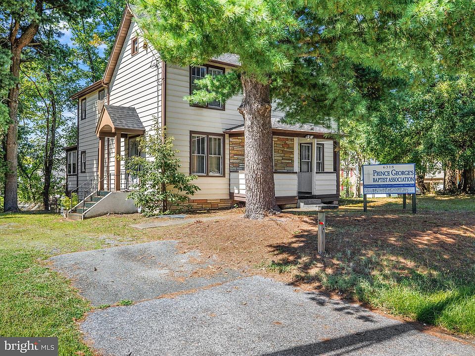 The zoning allows for a number of various uses. Previously, the property was used for the Prince Georges Baptist Association with an Exemption status (school/church), Although it's an older structure, it's unique in that it has a front porch facing Princess Garden Parkway and has an extended backyard facing and adjoining Pricilla Court, which is land and can be purchased separately. It's large enough to erect a new structure or extend the present house. Once entering the driveway there are parking spaces beginning at the front door and continues to the end of the property. There are approximately 15 parking spaces and a 2-car garage. The rooms are large and the kitchen can be made functional by the new buyer. There is another enclosed porch which can be exited or entered from any part of the yard. Look up the number of homes and businesses located on this street. The basement is small and unfinished.