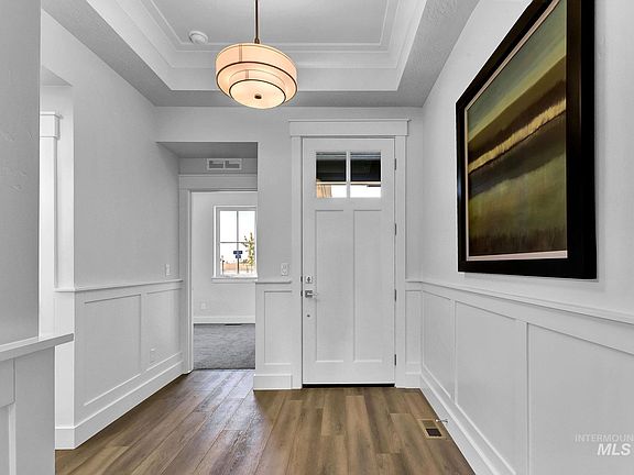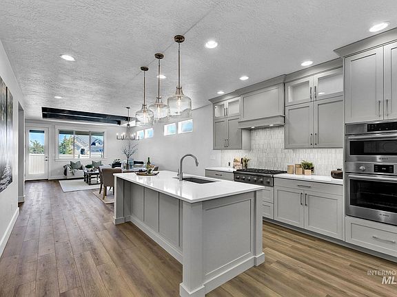 Charm and sophistication blend beautifully in the Luxury Home Gated Community of East Ridge Village. This home feels Brand New ~~ with an EPOXY garage floor and window coverings throughout. Custom cabinetry, Thermador® and Bosch® appliances & a stunning Mosaic fully-tiled backsplash in the kitchen. The Primary Suite is paired with a fully-tiled shower w/ bench, tiled flooring, and custom make-up vanity. Unbelievable storage with 7 linen closets in addition to the walk-in pantry and bedroom closets! Covered back patio overlooks an East-facing back yard that is private, fully landscaped & fenced. Neighborhood park w/ covered gazebo and a fenced dog park area. Close proximity to 64-acre Discovery Park, South Meridian YMCA, a new Albertsons and several golf courses. Pics are similar, while the tour is of actual home with permission from the Builder. Furniture and staging not included.