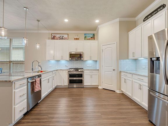 Looking for a multigenerational-friendly home with space, privacy, upgrades, and a true community feel? This 4 bed, 3 bath, 4-year-old one-owner home features TWO ensuite bedrooms. The primary suite includes a soaking tub, separate tiled shower, and a large walk-in closet. Every bedroom has its own walk-in closet and ceiling fan. The open floorplan with 10’ ceilings, crown molding, and upgraded appliances creates an inviting, elevated living space. The owners have easily hosted gatherings of 30+, and the built-in Dolby Atmos surround sound in the living room + outdoor speakers make movie nights and parties next-level. Smart home features include a video doorbell, thermostat, flood lights, and refrigerator with Samsung Family Hub. Double ovens, stone on three sides, fiber internet, two hot water heaters, and extra garage storage and a full privacy fence make daily living effortless. The pond entrance is right across the street, with dog park, baseball field, small park and benches.