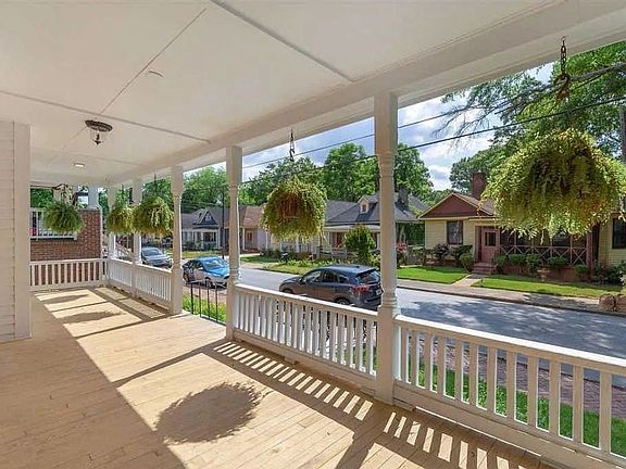 Amenities include a large wrap-around front porch, 11' ceilings, original restored hardwood floors, high end kitchen appliances, custom cabinets, a huge island, washer and dryer connections, driveway for off-street parking, and a fenced backyard.
