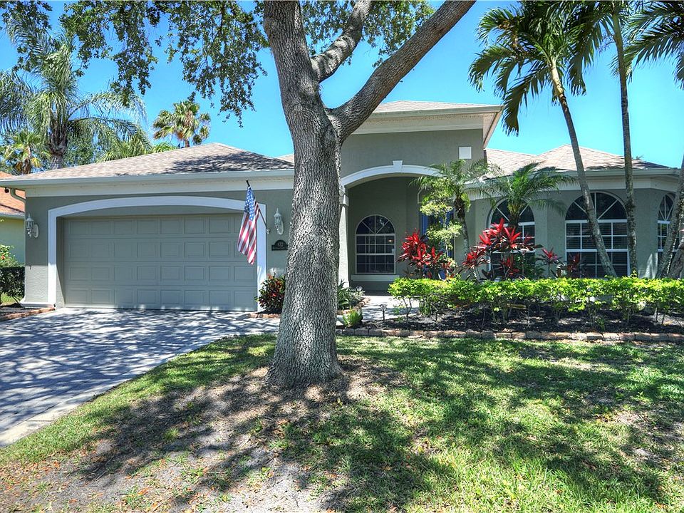 Beautifully furnished 4BD/3BA pool home in a private gated community with tennis, clubhouse pool & dock for sunset views. Enjoy a screened lanai with heated pool & spa, tray ceilings, spacious primary suite, multiple dining areas & a versatile bonus room. Central vac adds ease. Updates include new roof, A/C & pool heater. Move in ready fully furnished & full of charm. Close to beaches, dining, & shops! Room sizes approx. & subj. to verify. Enjoy peaceful lake views, lush tropical landscaping, & an inviting open layout perfect for entertaining