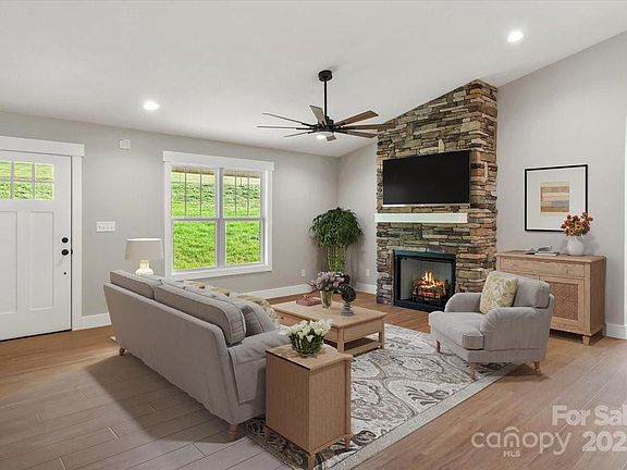 Nestled in the scenic mountains of Western North Carolina, Sky View Ridge is a premier new community in Madison County, located just 6 miles from downtown Weaverville. This picturesque subdivision offers convenient access to shopping, dining, whitewater rafting, hiking, skiing, and more—all while providing a peaceful country setting. This newly constructed home showcases quality craftsmanship and thoughtful design throughout. The open floor plan features vaulted ceilings in both the living area and the primary suite. A floor-to-ceiling stacked-stone gas fireplace anchors the living room, while the kitchen offers granite countertops, white Shaker cabinetry, and a sleek, inviting island. Additional features include a main-level laundry room and a split-bedroom layout for added privacy. The primary suite offers an en-suite bath with a granite double vanity and a walk-in shower. Outdoor living is a highlight, with a full-length covered front porch supported by six stone columns, perfect for rocking chairs, as well as a spacious covered back porch. Exterior finishes include white vinyl siding, stylish black windows (white interior), and black shutters. Inside, 3-panel doors and craftsman-style trim add a refined touch. Construction is complete and ready for its new owner. SELLER IS OFFERING $5,000 TOWARD THE BUYER'S CLOSING COSTS WITH AN ACCEPTABLE OFFER!!