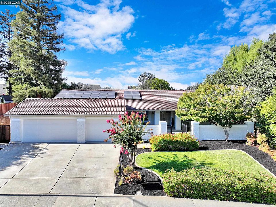 Welcome to this enchanting ranch-style home in Dana Hills, perfectly situated next to a verdant green belt and expansive open space. This inviting residence features 4 spacious bedrooms and 2 modern bathrooms, enhanced by high ceilings and a thoughtfully crafted floor plan. The updated kitchen is equipped with a double oven, tray ceiling, and recessed lighting, making it a culinary haven. Enjoy the ample lot size paired with a 3-car garage for added convenience. The home is enriched with new interior and exterior paint, elegant wood floors, owned solar panels, and a sturdy tile roof. The laundry room includes a utility sink and extra storage. The spacious primary bedroom offers an en-suite bathroom with a walk-in closet, separate tub and shower, and dual vanities. Residents can indulge in the community pool and enjoy stunning Mt. Diablo views from the cozy courtyard patio. Ideally located near a charming downtown, beautiful parks, scenic trails, excellent schools, and a variety of dining options. Open house, Sunday the 21st, 1:00-3:00
