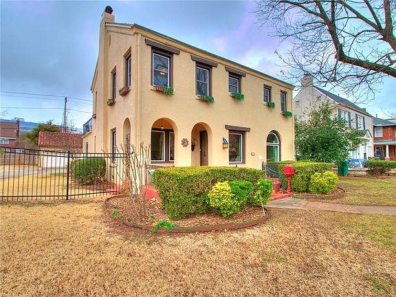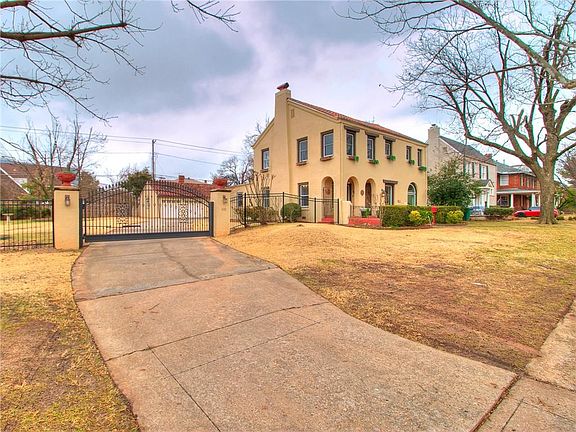Magnificent Mediterranean Villa located in the heart of Downtown OKC! A historic masterpiece sitting on a spectacular sized private double lot with a grand gated entrance. Boasting tall ceilings, refurbished oak wood floors, and a balcony with stunning views. Glamorous kitchen including updated white cabinets, butcher block countertops, gas stove, and stainless steel appliances including a refrigerator. Cozy up to the warm fireplace and enjoy a movie. Relax in the sunroom & grab a drink from the wet bar. Spacious master suite with a California closet and a master bathroom oasis complete with a walk-in shower. Wonderfully finished out basement with an office, media room, and bar area for fun game nights. Outdoor stone paver patio with a gas grill & fire pit perfect for entertaining family and friends. Large rebuilt 2-car garage with extra space for a shop or to finish out an apartment. Take a relaxing bike ride to Bricktown shops and restaurants. A short walk to the OU Medical Center.