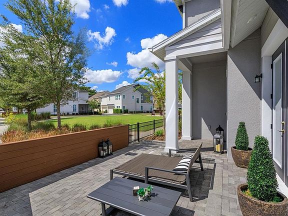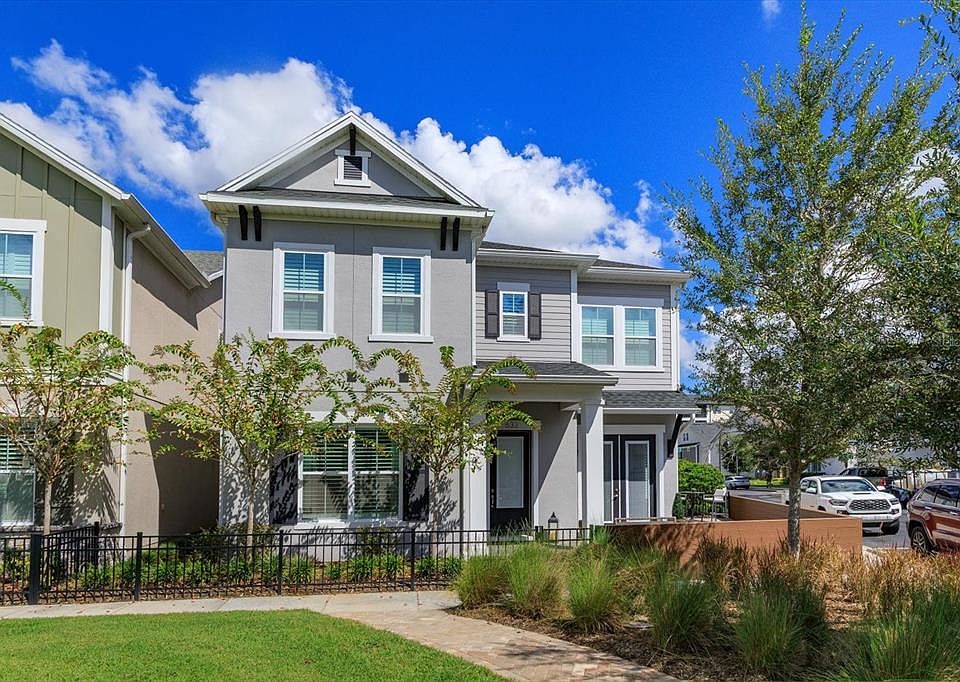 Stunning 4 bed, 3 bath home on a premium oversized corner lot in the highly desirable Griffin Park community. The home welcomes you with elegant exterior lighting, a spacious patio for entertaining, a fenced grass area with invisible fence, and exterior security cameras. Inside, enjoy luxury vinyl flooring throughout, recessed lighting, and plantation shutters on every window. The open-concept gourmet kitchen is perfect for entertaining, featuring quartz countertops, a gas range, beverage center, and high-end finishes. Sun-drenched living room with large windows and pre-wired surround sound creates a warm and inviting atmosphere. Main floor bedroom and bath offer versatility for guests or multi-generational living. Upstairs, a bright loft provides space for an office, playroom, or den, while the expansive master retreat boasts a spa-style bath with dual sinks, vanity, soaking tub, frameless shower, and a custom walk-in closet with built-ins and center island. Additional highlights include upstairs laundry with custom cabinetry, epoxy garage flooring, and overhead garage storage. Community amenities include a pool, dog park, and convenient access to shopping and major highways. Move-in ready with luxury finishes and thoughtful design throughout.