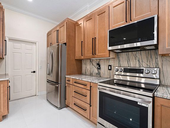Welcome to this beautifully updated 4 bedroom, 3 bathroom pool home with a desirable split, open-concept floor plan with no HOA. The formal living and dining area is bright and inviting, filled with natural light, while the layout transitions effortlessly into the updated kitchen with maple cabinetry, quartz countertops, and new stainless-steel appliances. Durable, easy-to-maintain porcelain tile flooring extends throughout into every room. The cabana bathroom feels like a private spa featuring a sleek 36'' oak black vanity, dimmable front and backlit mirror, frameless glass walk-in shower, and textured wall that adds a touch of warmth. The primary suite includes a 72-inch ceiling fan, dual walk-in closets, double vanities, and an upgraded walk-in shower with custom tile backsplash. Sliding glass doors provide direct access to the pool and patio area, making it easy to enjoy outdoor living right from your bedroom. This home is move-in ready and close to shopping centers, dining options, PGA Golf Club, and major highways.