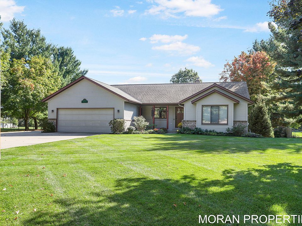 Welcome home to this inviting 3-bedroom, 3-bath ranch-style residence set on spacious acreage. Enjoy a beautiful sunroom and a deck that overlooks a private backyard, perfect for relaxing or entertaining guests. The open-concept layout connects the kitchen—featuring a convenient snack bar—to the dining area, which flows seamlessly into the sunroom. The living room boasts a cozy fireplace and a wall of windows with tranquil backyard views. A mudroom with laundry and a full bath adds functionality to the main floor. The primary bedroom offers private bath access, and an additional bedroom completes the main level.