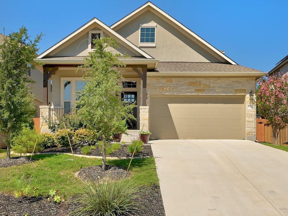 Beautifully maintained home with a private backyard in the award-winning Sweetwater community. This home offers great curb appeal with a spacious covered front porch and Hill Country views. Inside, the open-concept layout features high ceilings, natural light, and an oversized kitchen with granite countertops, a gas cooktop, built-in oven, and ample storage. On the main level, you'll find the primary suite, a guest room and guest bath, and an office with a walk-in closet (could be converted into another bedroom with privacy doors). Upstairs, you’ll find a spacious game room and private guest suite with a full bath—perfect for visitors or multi-generational living. The primary suite includes a bay window, dual closets, and a walk-in shower with mud-set tile and quartz countertops. Enjoy outdoor living on the large covered patio with no neighbors behind for added privacy. All appliances convey. Sweetwater residents enjoy resort-style amenities, including two clubhouses with pools, a fitness center, athletic fields, playgrounds, a dog park, and miles of scenic trails. Zoned to top-rated Lake Travis ISD and just minutes from Lake Travis, shopping, and dining.