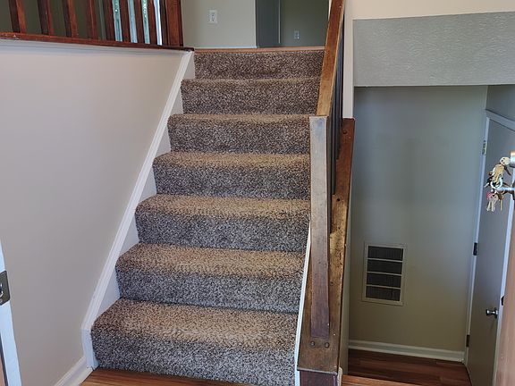 This cozy three-bedroom home features one full bathroom and one half bathroom. It includes marble-designed countertops, a mosaic tile backsplash, brushed nickel fixtures, ceiling fans, new lighting, and a gas fireplace. The property features a two-car attached garage and a walkout basement that opens onto a large, fenced-in backyard with a deck.